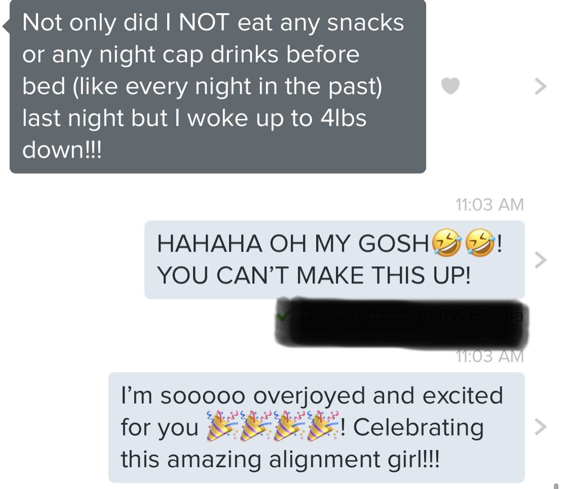 "Non seulement je n'ai PAS mangé de collations ni de boissons sous forme de dernier verre avant de me coucher hier soir, mais je me suis réveillé avec 4 livres de moins !!"